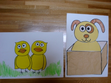 これは私が大学生の時に教育実習で用意した絵。へへへ。There is/There are(~がいる/ある)の単元を担当したのですが、右側の絵で生徒に「英語の言い方はわかるけど、絵が犬か猫か分からない」と言われた思ひ出・・・。